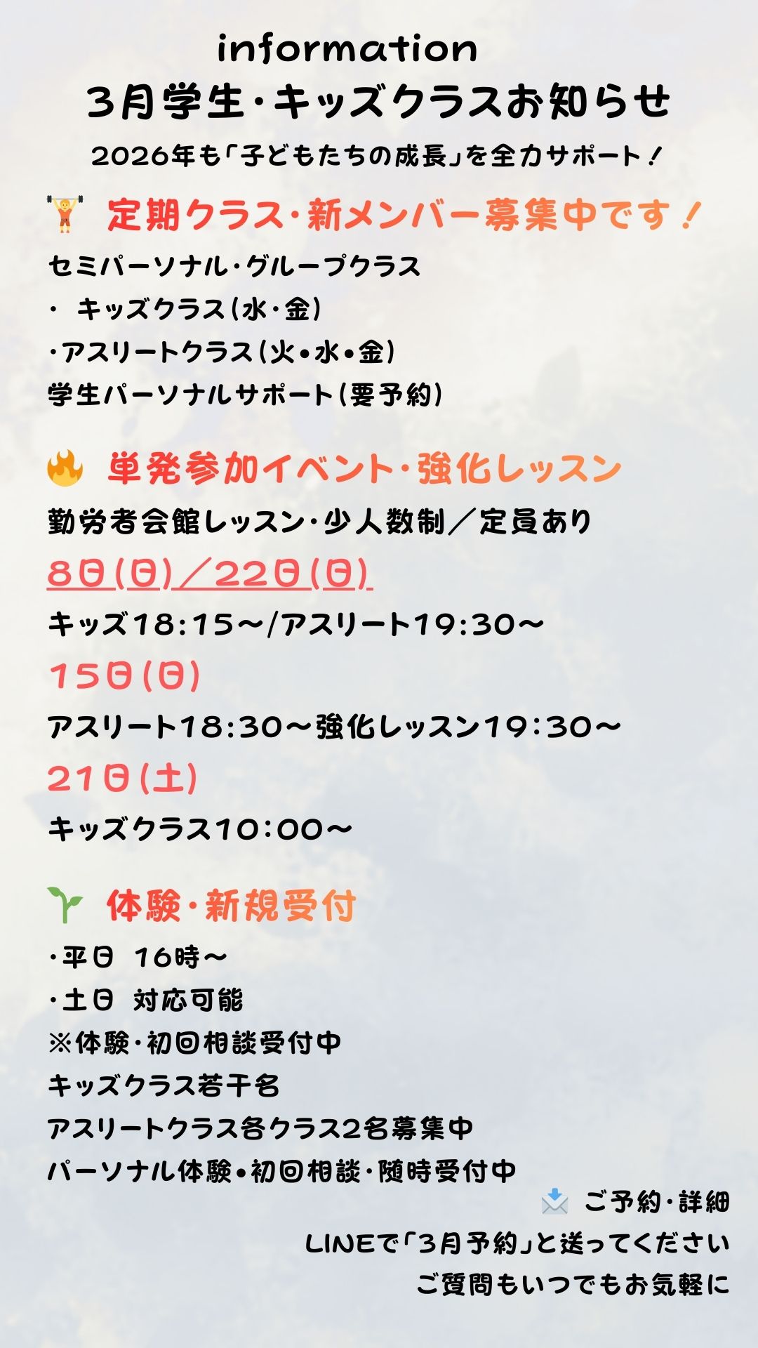 Uncategorized 2026年3月キッズ/アスリートクラス/小中学生向け運動教室/運動が苦手でも🔰プロを夢見る子でも minorleager751@gmail.com 2026年3月3日 勤労者会館をお借りしてのレッスンは アスリート向きのクラスへ 運動を頑張っている小学生5年生以上から参加できる トレーニングクラスを開催します! 高校に向けたカラダ作りを目指しメニューを組んできました! 基本的に中学生くらいの動きが理解できる子たちに向けたトレーニングです めっちゃお得なのでぜひご参加ください! その他の時間または、曜日での開催をご希望の方はぜひお声がけください! 予定設定の参考にさせていただきます! お申し込みはLINEから