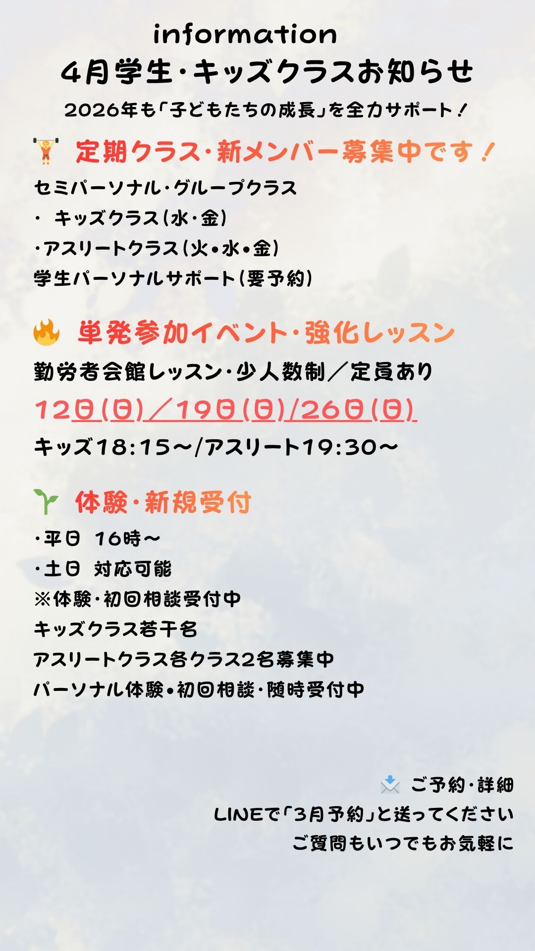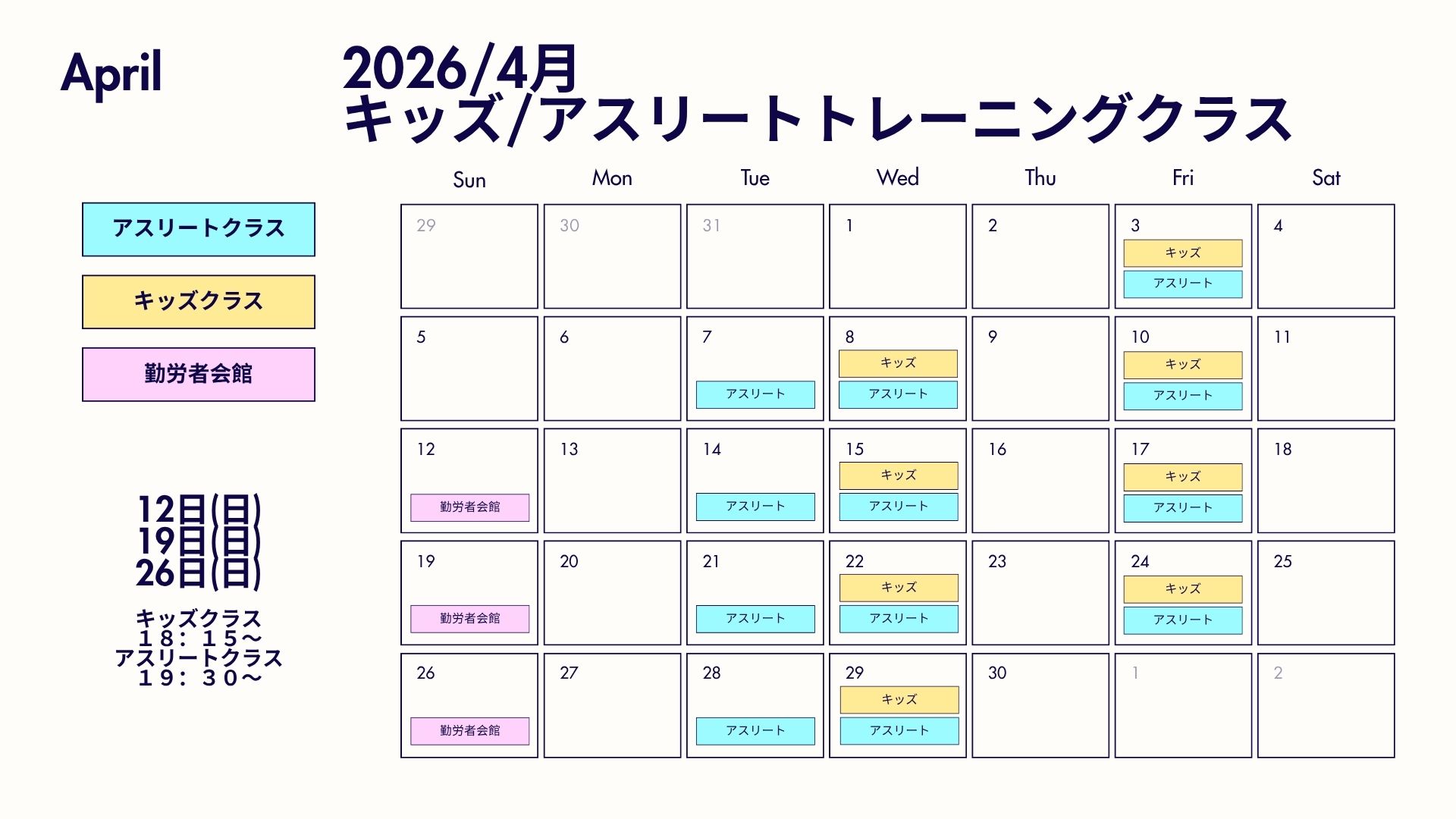 Uncategorized 2026年4月キッズ/アスリートクラス/小中学生向け運動教室/運動が苦手でも🔰プロを夢見る子でも minorleager751@gmail.com 2026年4月4日 勤労者会館をお借りしてのレッスンは アスリート向きのクラスへ 運動を頑張っている小学生5年生以上から参加できる トレーニングクラスを開催します! 高校に向けたカラダ作りを目指しメニューを組んできました! 基本的に中学生くらいの動きが理解できる子たちに向けたトレーニングです めっちゃお得なのでぜひご参加ください! その他の時間または、曜日での開催をご希望の方はぜひお声がけください! 予定設定の参考にさせていただきます! お申し込みはLINEから